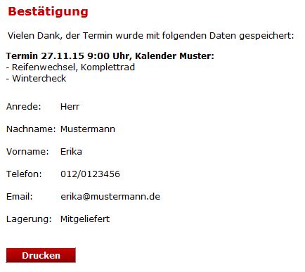 Am Ende erhält Ihre Kunde die Bestätigung der Buchung. Dort könnten auch Links zu weiteren Informationen oder einem Bezahlsystem untergebracht werden. In vielen Fällen