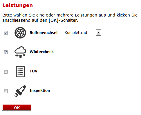 Sie können selber bestimmen, welche Daten Sie von Ihren Kunden abfragen. Hier wird beispielsweise abgefragt, ob die Reifen eingelagert sind oder mitgeliefert werden.