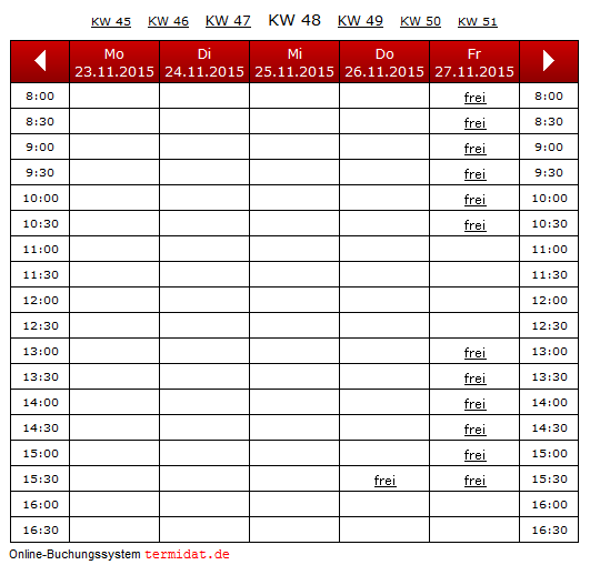 Das Ergebnis der Berechnungen entscheidet, welche Zeiten zur Buchung angeboten werden. Im einfachsten Fall werden diese in einer Wochenansicht mit festem Raster angezeigt.